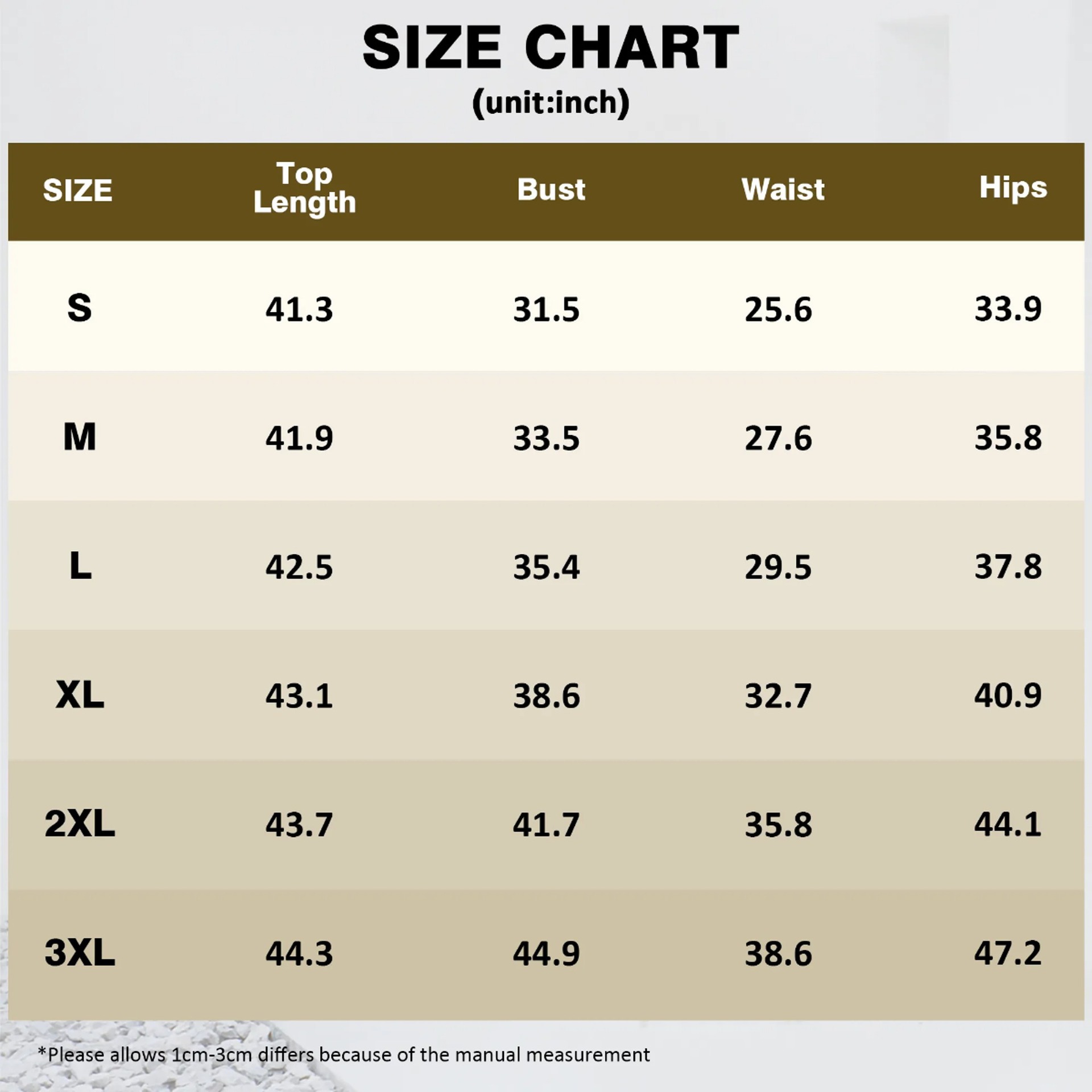 - Size chart